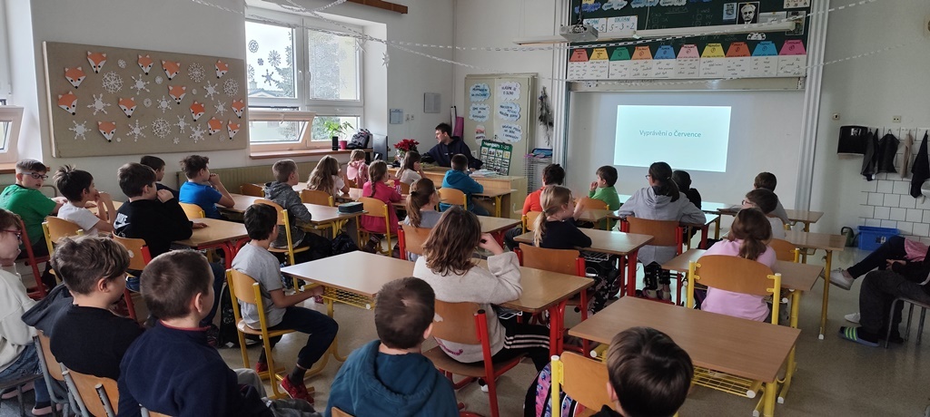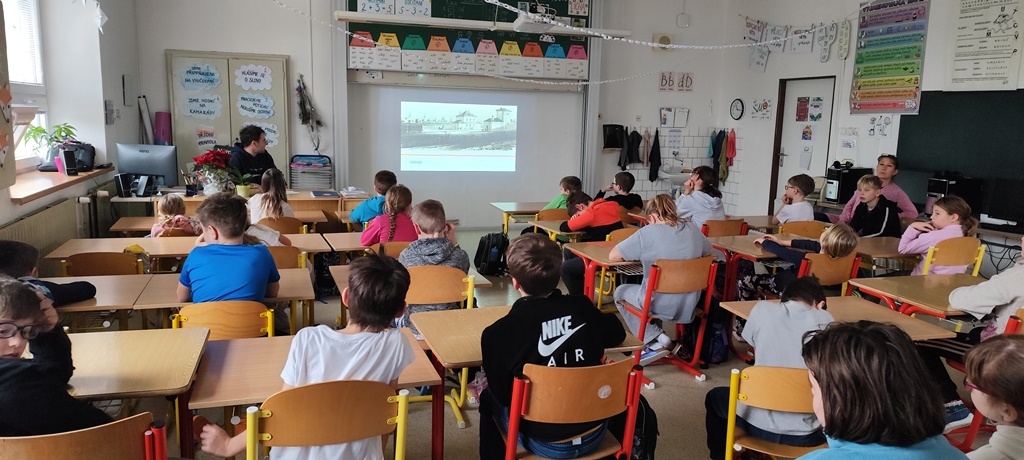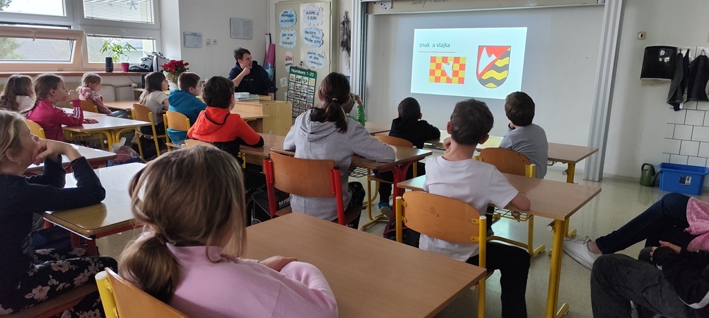Žáci 3.-5.ročníku se setkali s kronikářem obce panem Michalem Frankem. Připravil si pro ně krátké seznámení s nejdůležitějšími zajímavostmi a historickými momenty z naší obce. Mnozí z nich dokázali odpovídat na jeho otázky, protože si žáci s učiteli v rámci Prvouky o obci již povídali. Besedu kronikář prokládal fotografiemi, které promítal na tabuli.