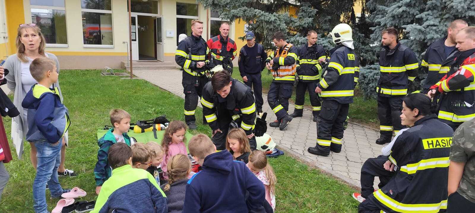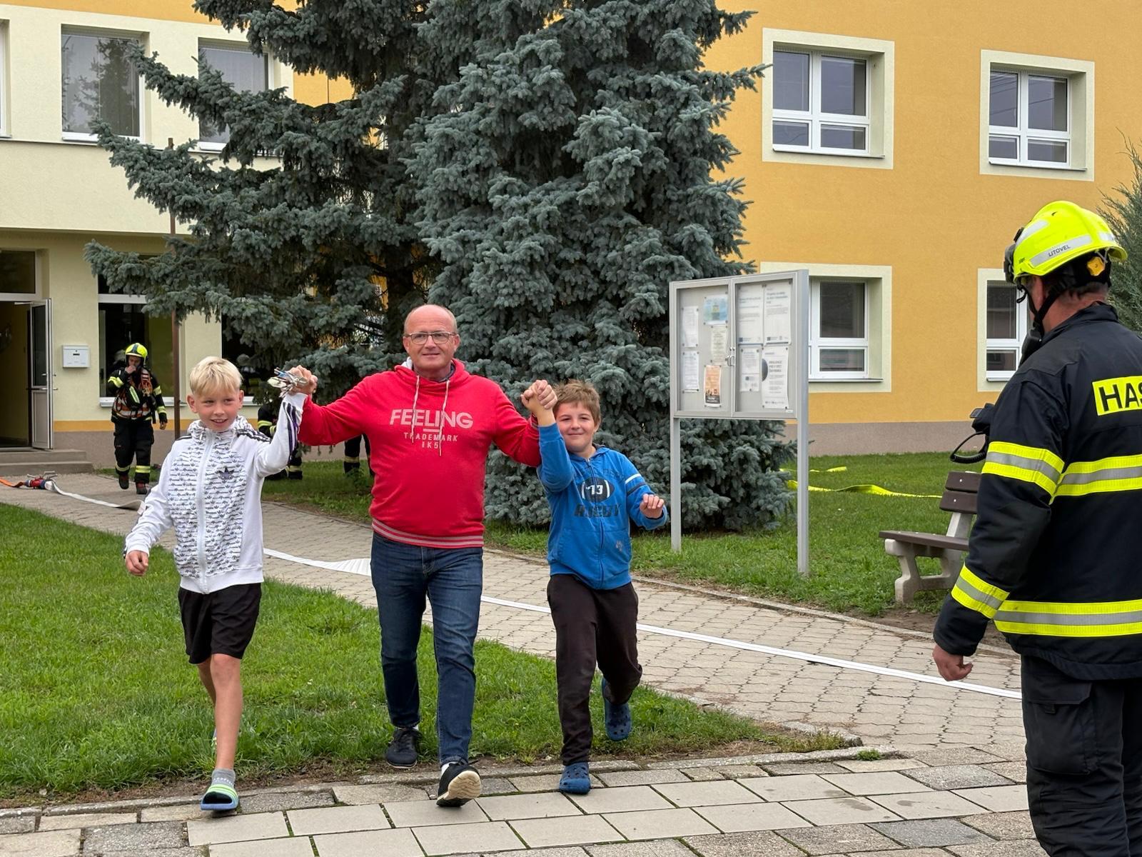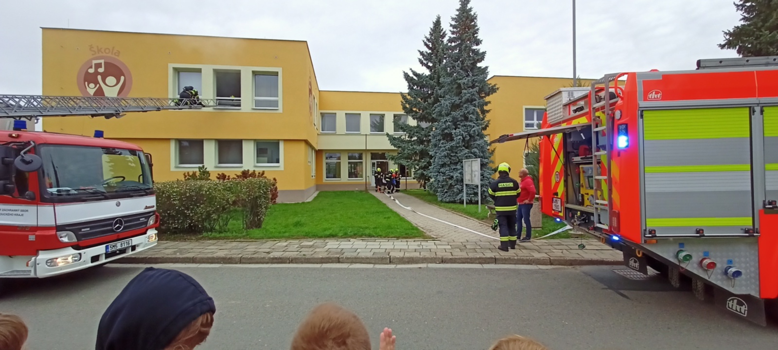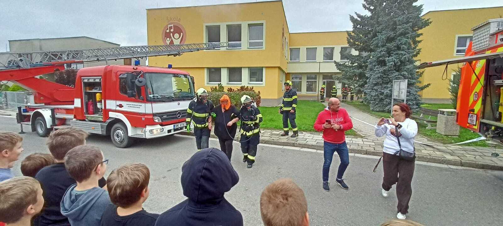 Ve čtvrtek 18. září proběhlo na naší škole taktické cvičení hasičských sborů z Litovle a Tří Dvorů. Chodbami školy se šířil uměle vytvořený kouř a byl vyhlášen požární poplach. Žáci a zaměstnanci školy se přemístili na určené místo. Následně přijely hasičské hlídky a bylo jim sděleno, že ve škole zůstaly tři osoby (předem domluvení dva stateční žáci z pátého ročníku a paní školnice). Se svolením velitele hasičů se mohli všichni evakuovaní přemístit zpět před školu a sledovat, jak probíhá záchrana ohrožených osob. Po chvíli byly zachráněné osoby bezpečně vyvedeny ze školní budovy v dýchacích maskách, které si pak přihlížející mohli také vyzkoušet. Kromě toho si žáci zkusili základy první pomoci a prohlédli si hasičskou techniku. Na závěr se všichni společně vyfotili.